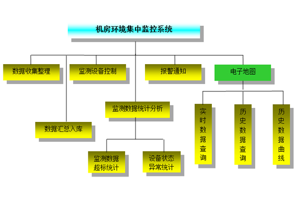 机房联网监控管理系统采用分散部署集中监测的模式,集中监控中心作为一级管理单位,主要负责收集各个监测点数据,可通过权限分级管理,监控中心可直接采集、监控、处理相关信息;各监测点管理人员可通过授权监控本辖区内的机房状况。整个监控系统联网采用内部专网传输方式,系统对于前端各个被监控的动力子系统、环境子系统、消防子系统、安防子系统、视频子系统等集中监控管理功能。